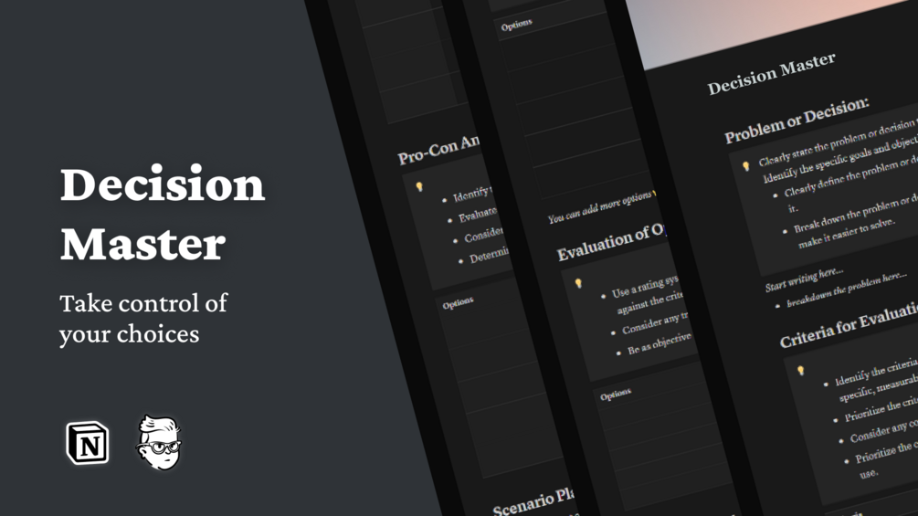A comprehensive tool designed to help individuals and teams make better decisions. This template is based on research and best practices and includes prompts and exercises for each step of the decision-making process.